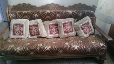 Pic2- A Thick Bed Sheet has been used as a Sofa Cover. Also additional Cushions have cloths stuffed inside it. copyright- @ RohanSinha |